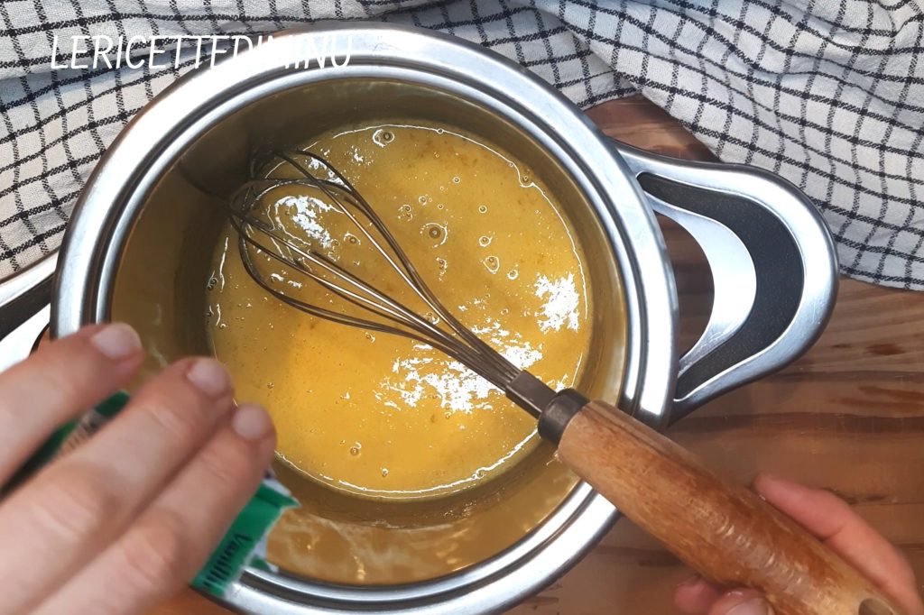 Wanneer je een homogeen en klontvrij mengsel hebt verkregen, voeg je de in stroken gesneden citroenschil toe. Verplaats vervolgens het pannetje naar het vuur en breng het op matig vuur aan de kook.