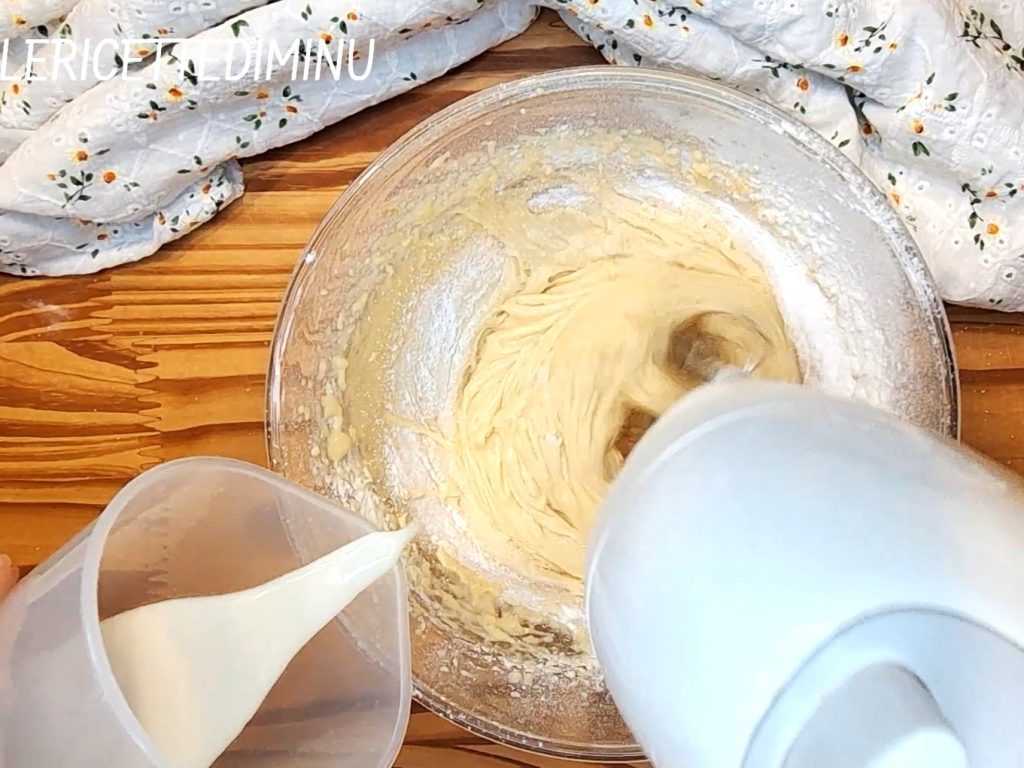 Daarna de gezeefde bloem beetje bij beetje, vervolgens ook het gezeefde bakpoeder.