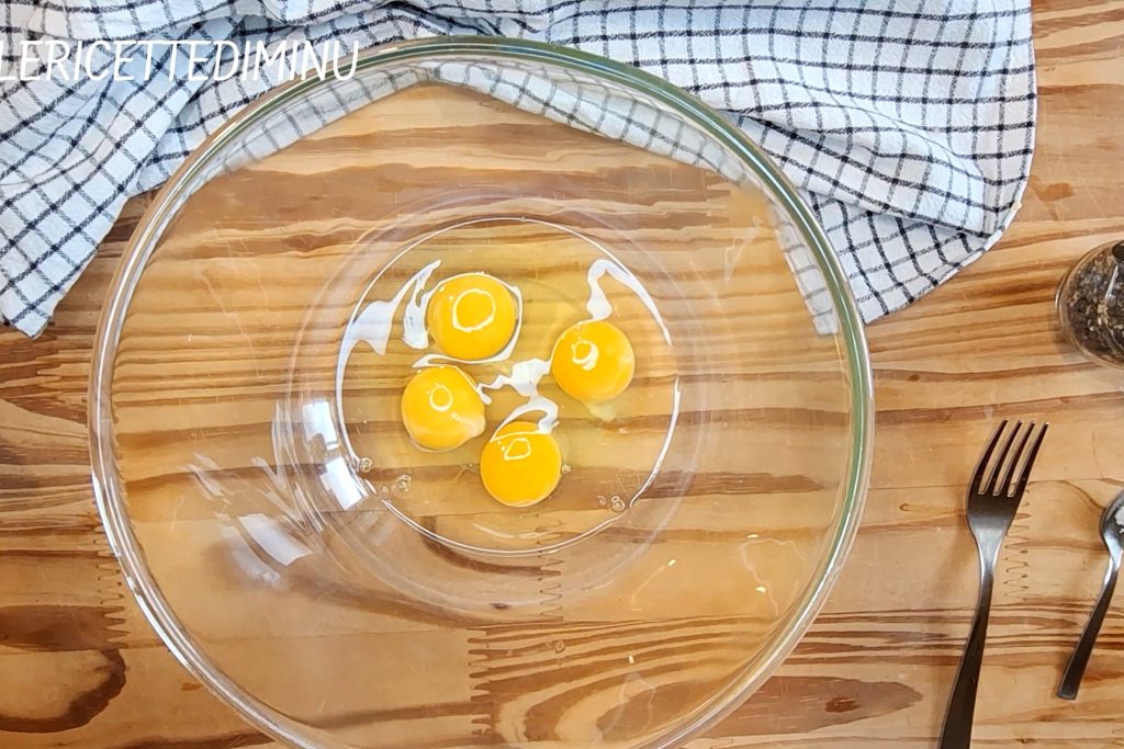In een grote kom 5 eieren (ik had 4 hele eieren en 2 eiwitten om te gebruiken en dus heb ik deze gebruikt), geraspte Parmezaan, een snufje zout en zwarte peper, bij voorkeur versgemalen, mengen.