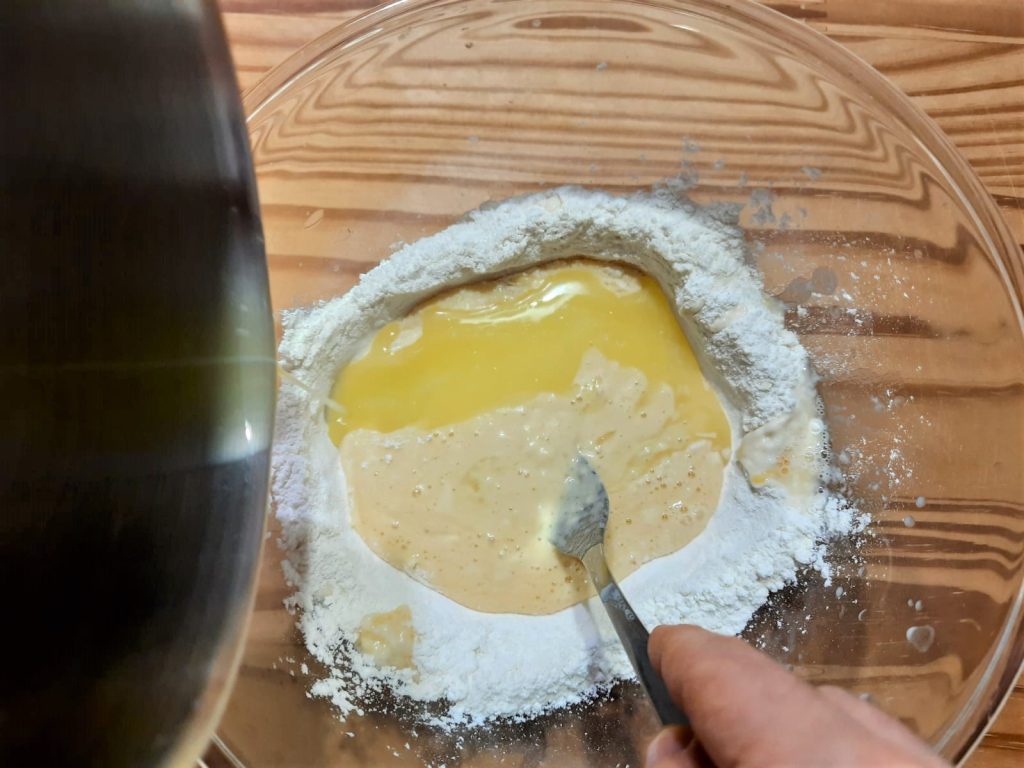 Voeg 1 medium ei toe en terwijl je roert met een vork, giet het warme water, de boter en de grappa erbij.