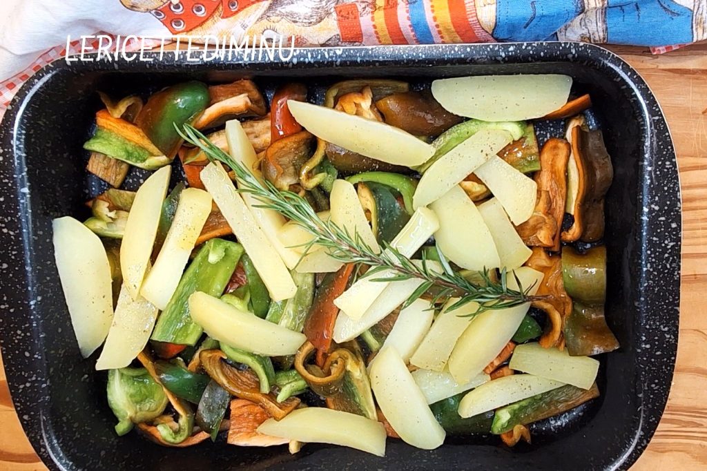 Voeg in een antiaanbak bakplaat paprika’s en aardappelen samen, voeg een takje rozemarijn, olie, vers gemalen zwarte peper en een matige snuf zout toe.