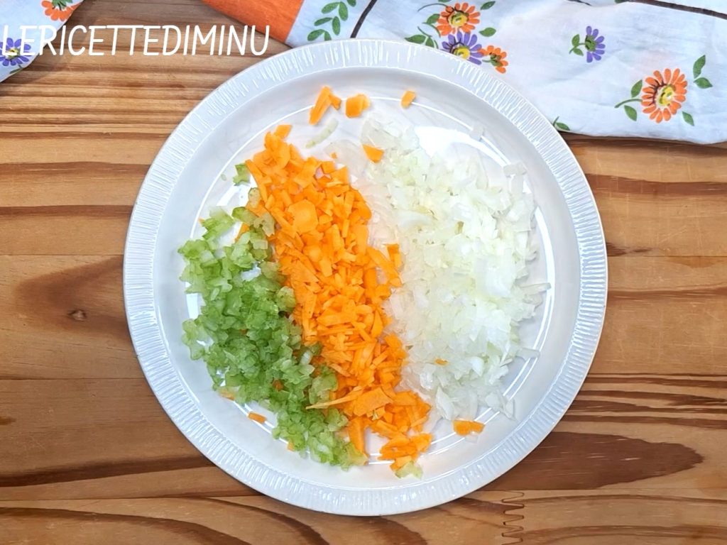 • Met een keukenmes (ik raad aan deze), bereid op een snijplank een mengsel van ui, selderij en wortels.