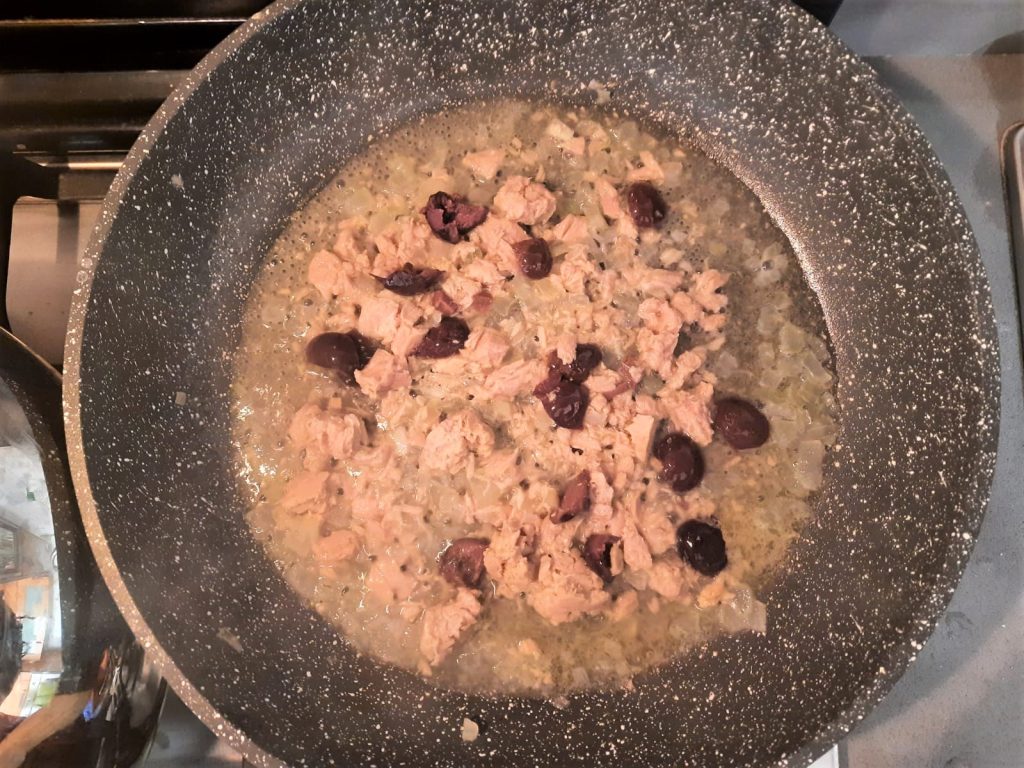 Wacht tot de ui een beetje kleur krijgt en voeg dan de uitgelekte en verkruimelde tonijn, de in stukken gesneden zwarte olijven en een stuk hete rode chilipeper toe. Laat een paar minuten smoren, af en toe roeren.