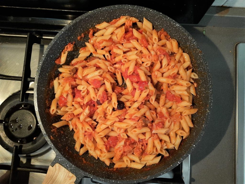 De pasta met tonijn, tomaat en olijven is nu klaar.