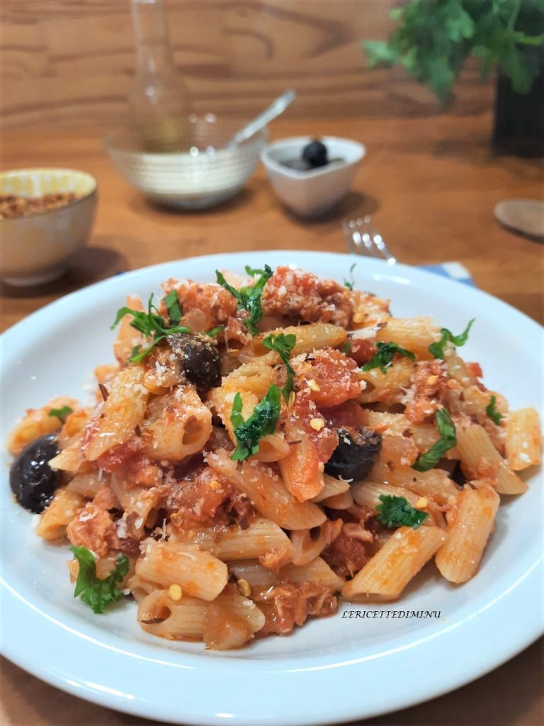 De pasta met tonijn, tomaat en olijven is een smakelijk hoofdgerecht, eenvoudig te bereiden, zelfs voor degenen die nieuw zijn in de keuken.