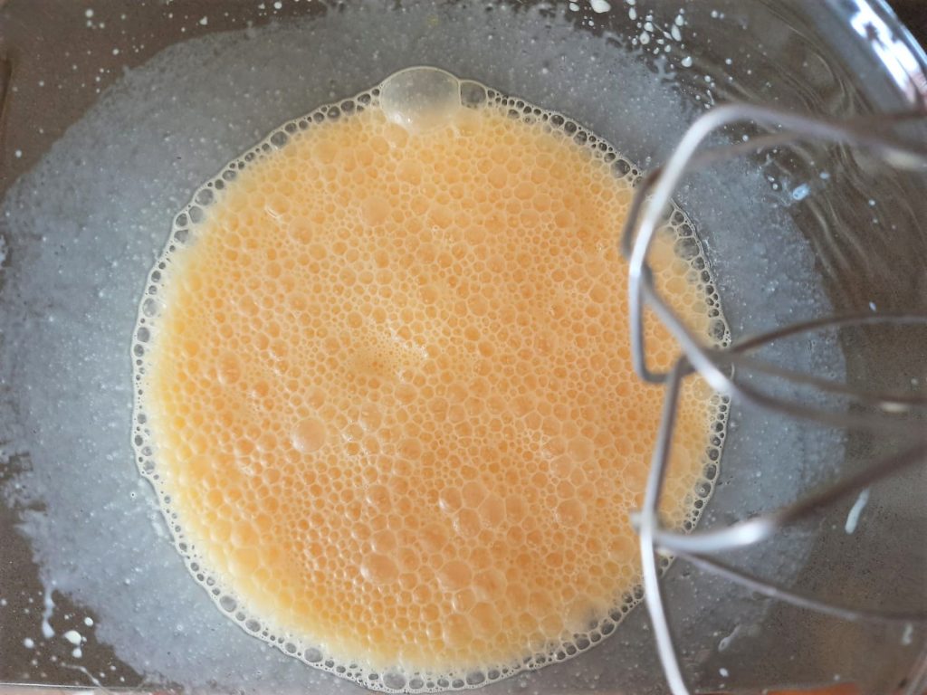 Werk in een grote kom de losgeklopte eieren, de boter (gesmolten en afgekoeld) en een snufje zout met de elektrische mixer, voeg vervolgens de poeders toe en blijf kloppen.
