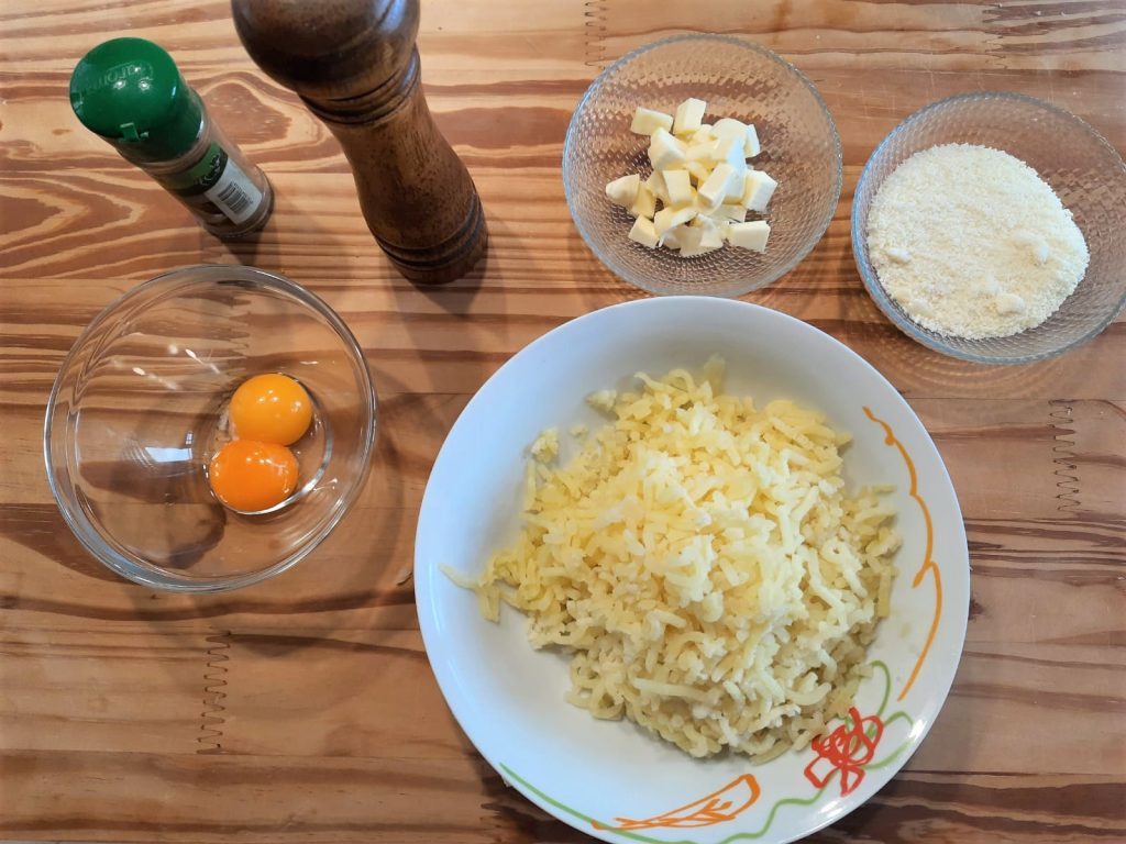 Wanneer ze gaar zijn, pers de warme aardappelen door de aardappelstamper en voeg direct de boter, de kruiden, de geraspte Parmezaanse of Grana kaas, en de 2 eidooiers toe.