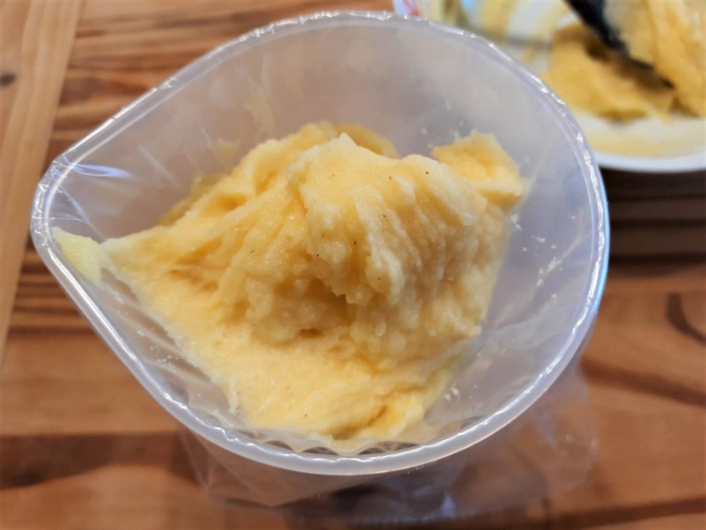 Monteer het stervormige mondstuk op de spuitzak en open de zak door deze (zoals op de foto) in een hoge beker te bevestigen. Op deze manier wordt het eenvoudig om deze met het mengsel te vullen.