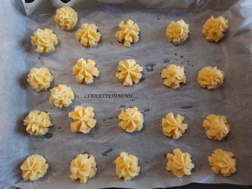 Laat de net gevormde hertoginnenaardappelen direct op de beklede bakplaat vallen, met een kleine afstand tussen elkaar.