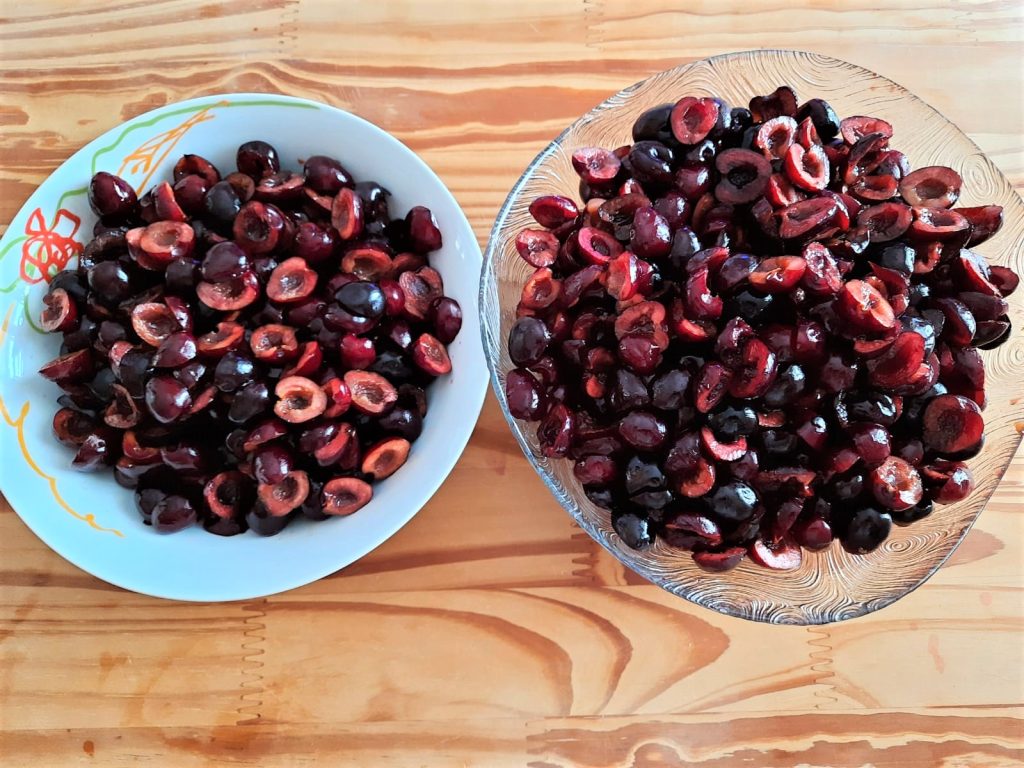 Verwijder de steel en ontpit ze, zorg ervoor dat ook hun sap in de kom valt waar we het respectievelijke kersenpulp in laten vallen.
