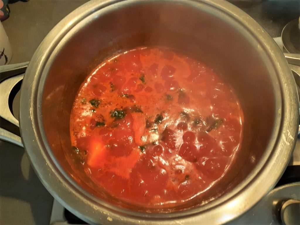 Verhit in een braadpan olijfolie met fijngehakte knoflook en peterselie, voeg vervolgens de tomatenpassata (of tomatenpulp) en een glas water toe.