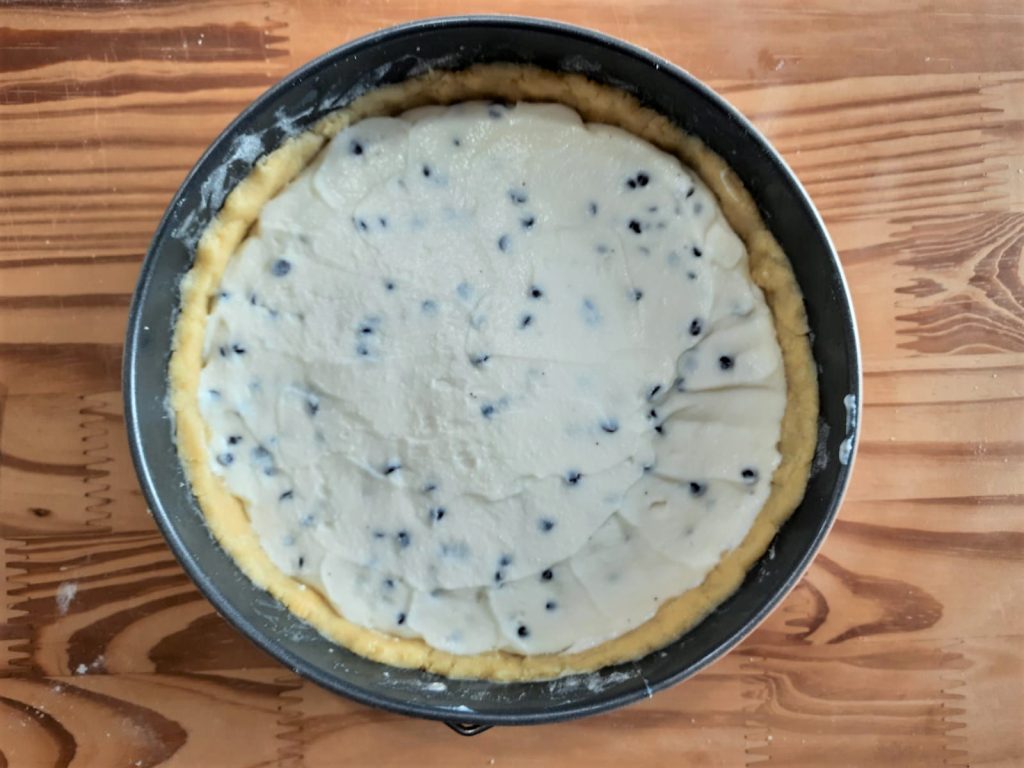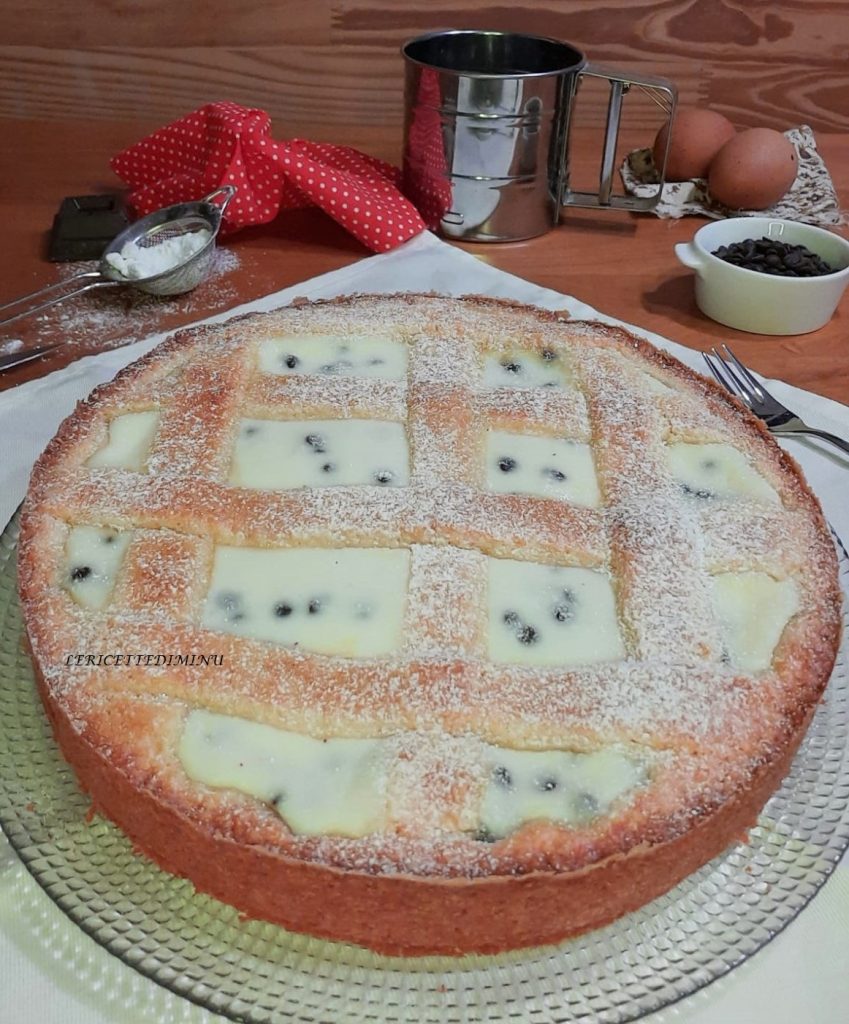 De ricotta en chocoladedruppel taart is een heerlijke taart bestaande uit een korst van zanddeeg en een verrukkelijke vulling van ricotta en chocoladedruppels.