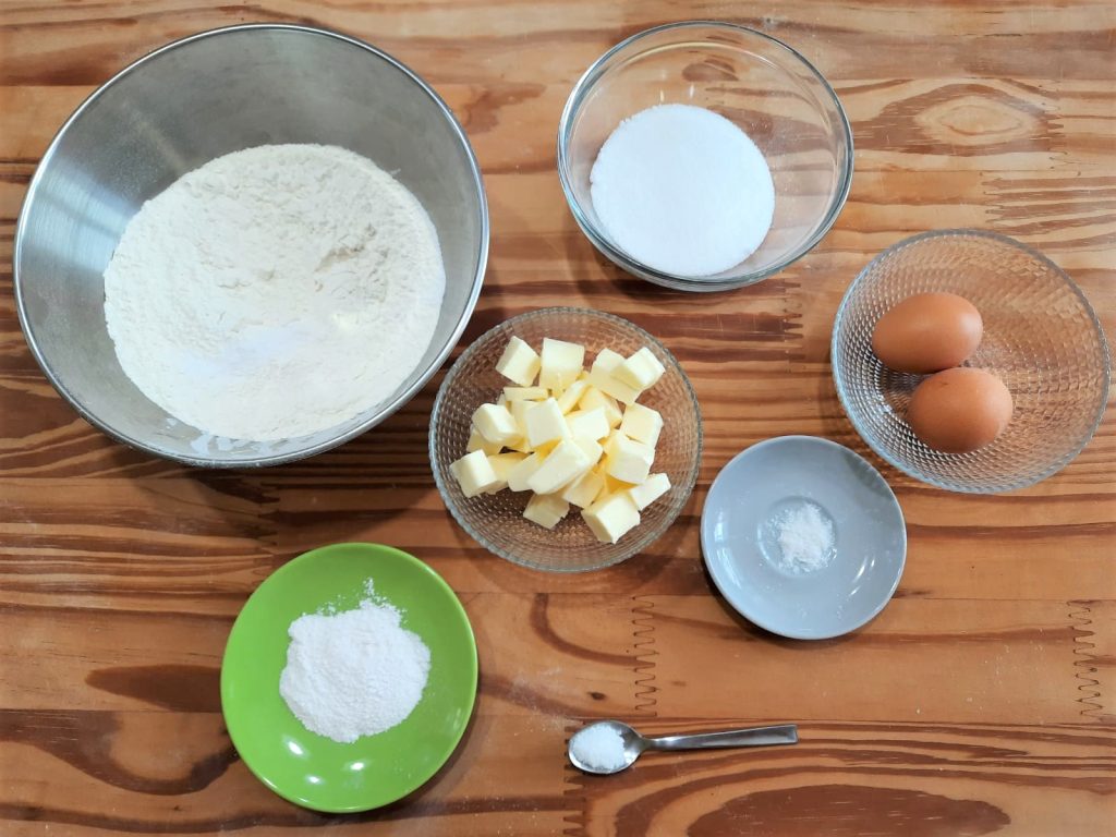 • Per de ricotta en vijgen taart te bereiden, werk eerst de bloem en koude boter in stukjes, voeg vervolgens de suiker, losgeklopte eieren, gezeefde bakpoeder, vanille-extract en een snufje zout toe en meng.