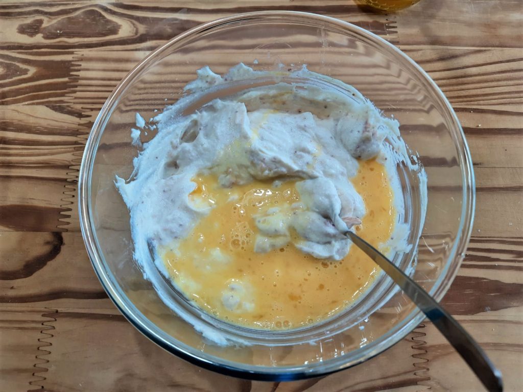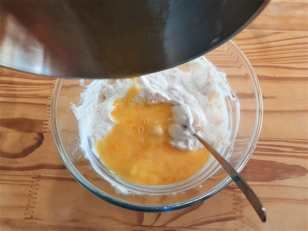 • Werk in een kom de uitgelekte ricotta met de suiker, vanille-extract en 1 losgeklopt ei met de hand.