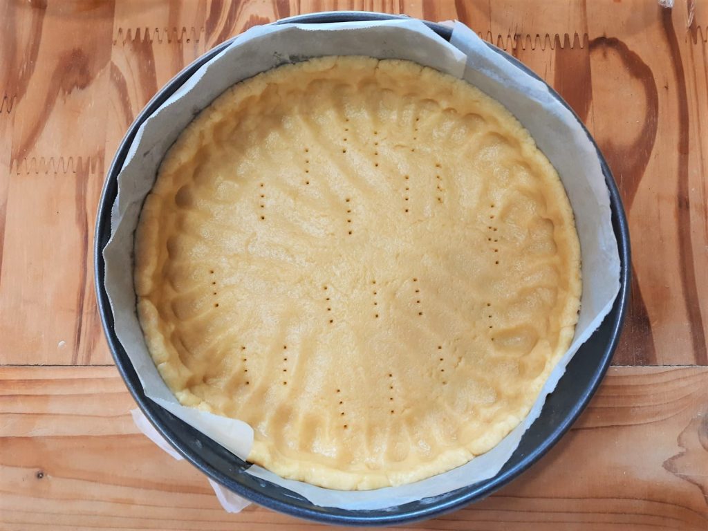 • Rol het hele deeg uit met een deegroller en plaats het in een met bakpapier beklede springvorm.