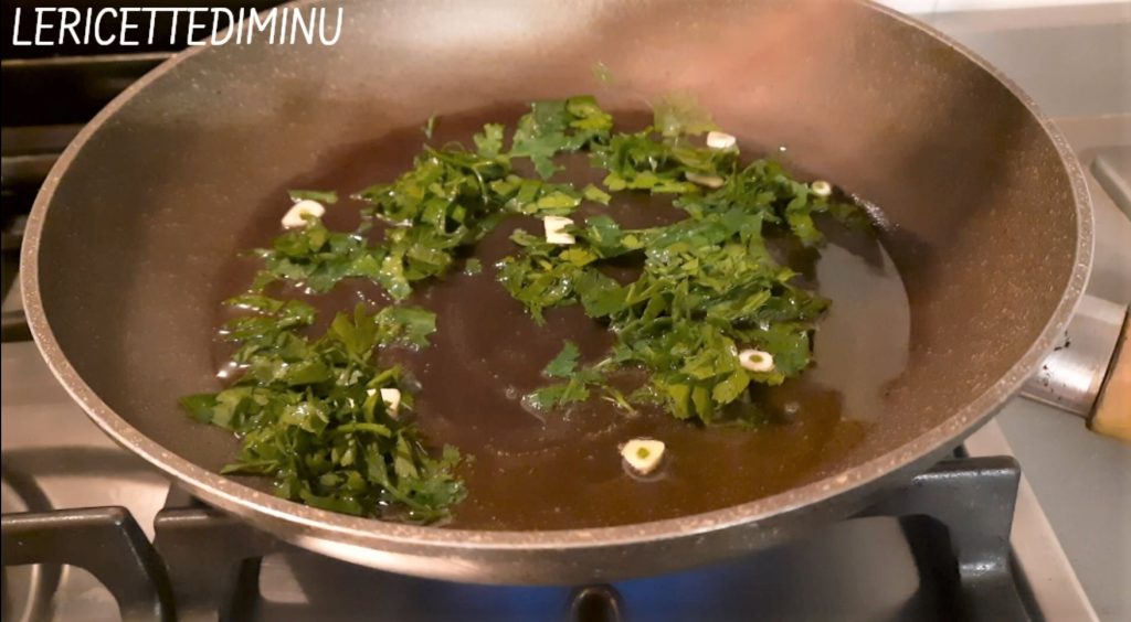 • Snij een teentje knoflook en 20 gr verse peterselie in kleine stukjes en doe ze in een stoofpan met een scheutje olijfolie.