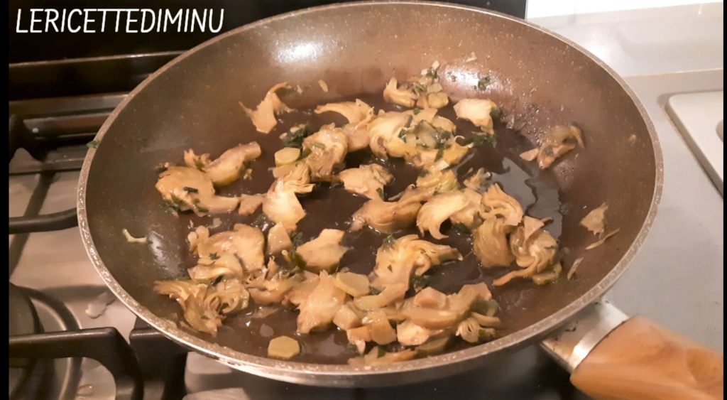 • Voeg de artisjokken toe die we in plakjes hebben gesneden en hun stelen in dunne plakjes.
