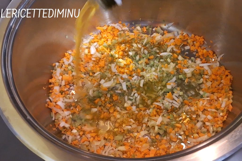 • Om de Siciliaanse ragù te bereiden, begin met het fijnhakken van de ui, wortel en selderij op de snijplank, en breng ze vervolgens over in een grote pan met olijfolie.