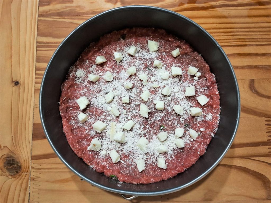 Vorm van het gekruide gehakt een pizza met een opstaande rand en voeg daarbovenop blokjes kaas en geraspte Grana toe.