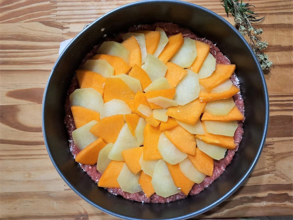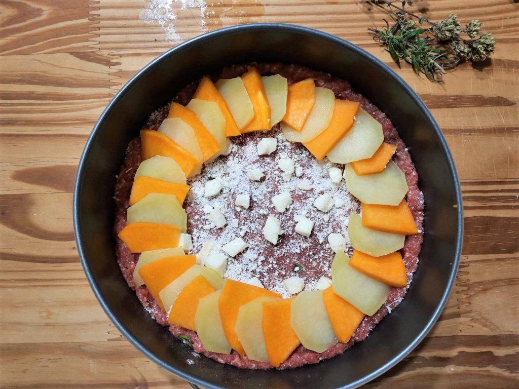 Het bestaat uit heerlijk gekruid gehakt zoals voor gehaktballen, goede kaas en vervolgens een decoratieve ring van aardappel- en pompoenschijfjes, wat samen een combinatie creëert die net zo mooi is om te zien als lekker om te eten.