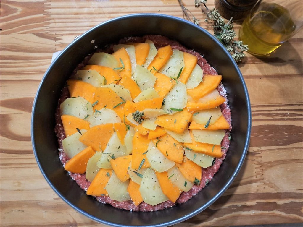 De vleestaart met pompoen en aardappelen is nu klaar.