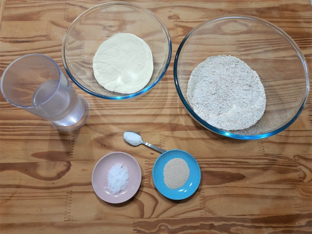 In een kom, meng volkorenmeel, griesmeel, gedroogde gist en suiker.