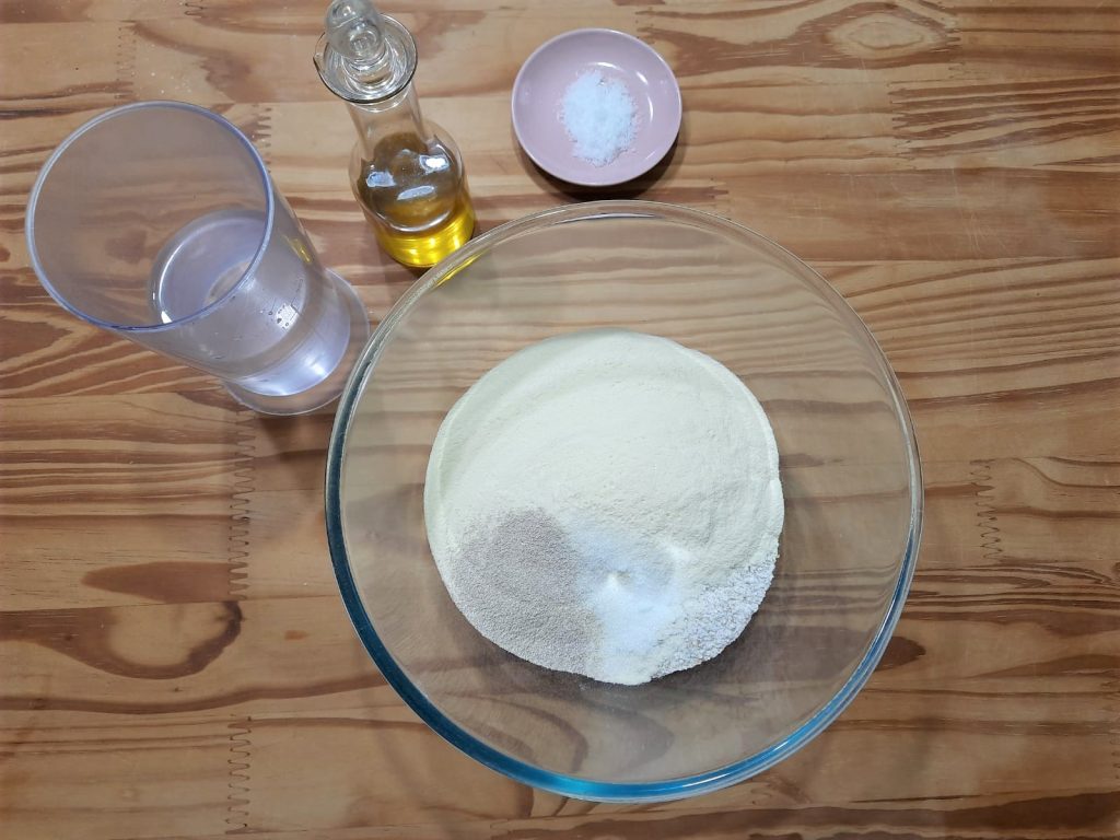 Begin met kneden door geleidelijk de helft van het water toe te voegen dat in het recept staat. Voeg dan het zout en de olie toe en blijf kneden met het resterende water totdat je een elastisch en goed werkbaar deeg hebt, maar niet te zacht.