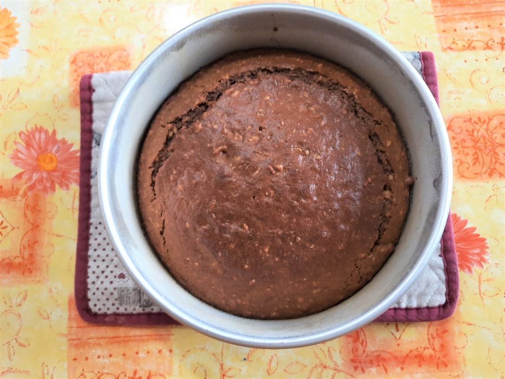 Giet alles in een ingevette en met bloem bestoven taartvorm met een diameter van 22 cm. Bak het in een voorverwarmde oven, op 180 graden, middel/lage stand van de oven, statische functie ongeveer 45 minuten.