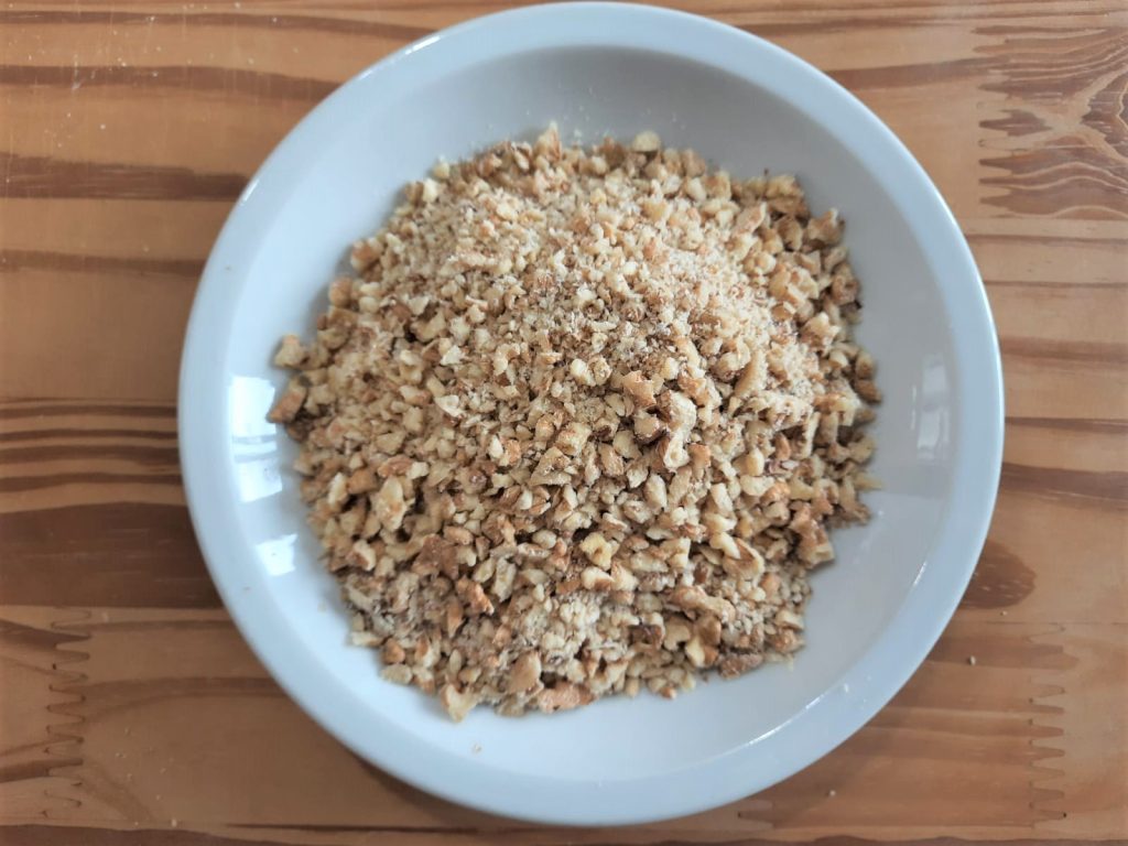 Zodra een goed gemengd en fluweelachtig mengsel is verkregen, voeg de gehakte walnoten toe en draai met een spatel.