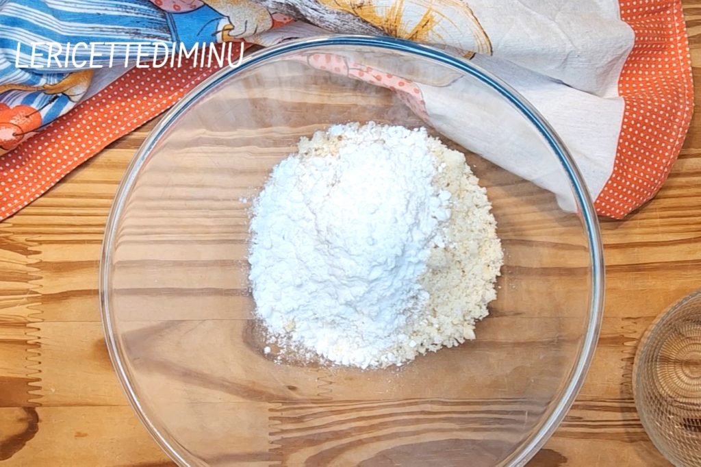 In een kom de bloem 00, de amandelkorrels met de suiker, het aardappelzetmeel, de vanilline, het gezeefde bakpoeder, de zachte boter in stukjes, het ei en het zout mengen.