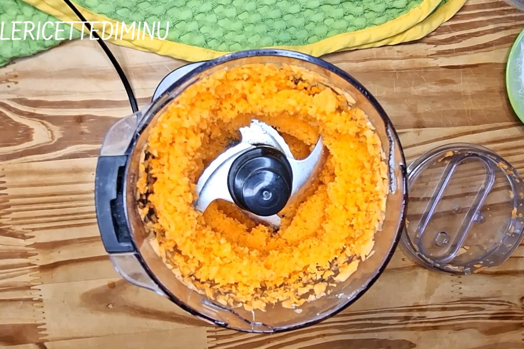 Wanneer een homogeen mengsel is verkregen, voeg dan de gehakte amandelen en gemalen wortels toe. Goed roeren.