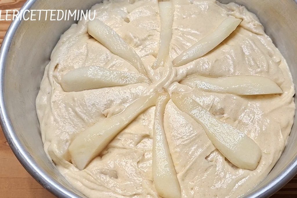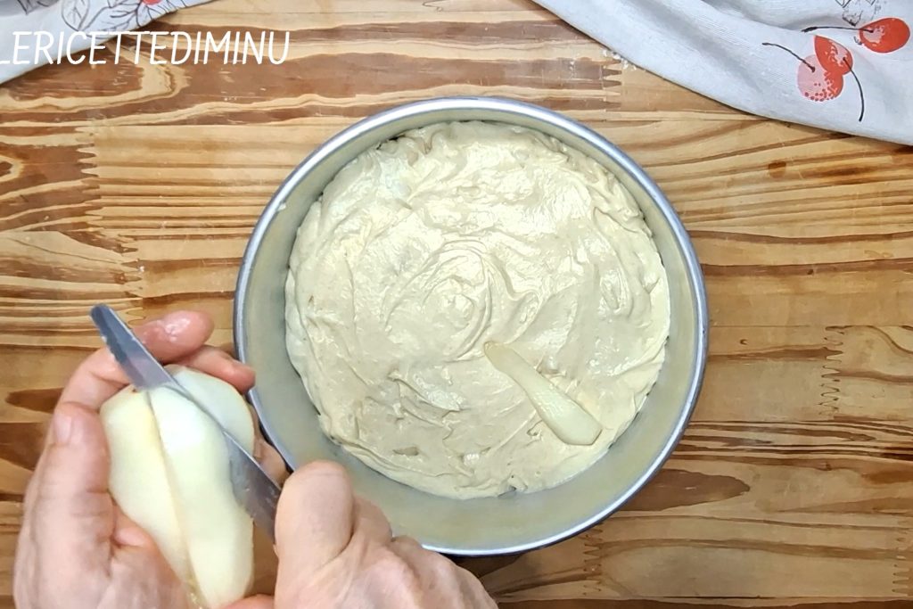 Schil een andere peer en snijd deze in partjes die worden gerangschikt in een straalsgewijze vorm op het oppervlak van het dessert, goed onder het deeg steken.