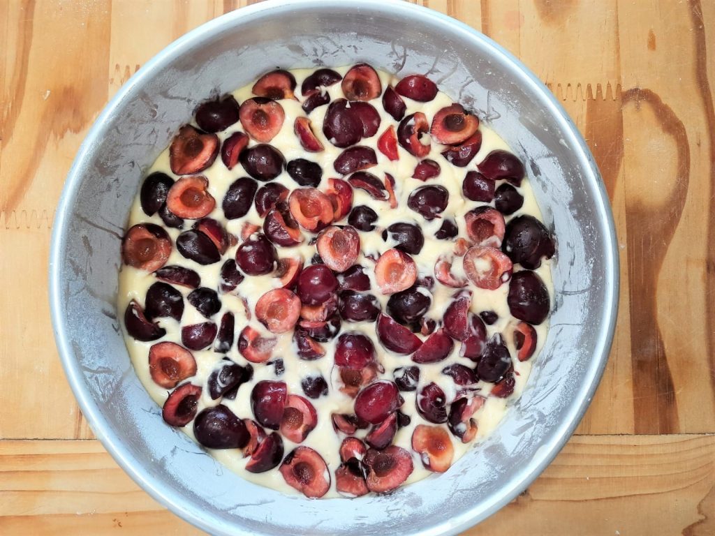 Doe het mengsel in de bakvorm en giet er op dit punt de kersen overheen, verdeel ze gelijkmatig en druk ze lichtjes aan met de achterkant van een lepel.
