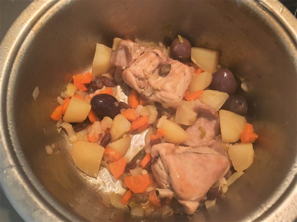 Fruit in een aparte pan ui, wortel en selderij in stukjes, aardappelen in blokjes, het laurierblad, de pijnboompitten en het konijn uit de bouillon.