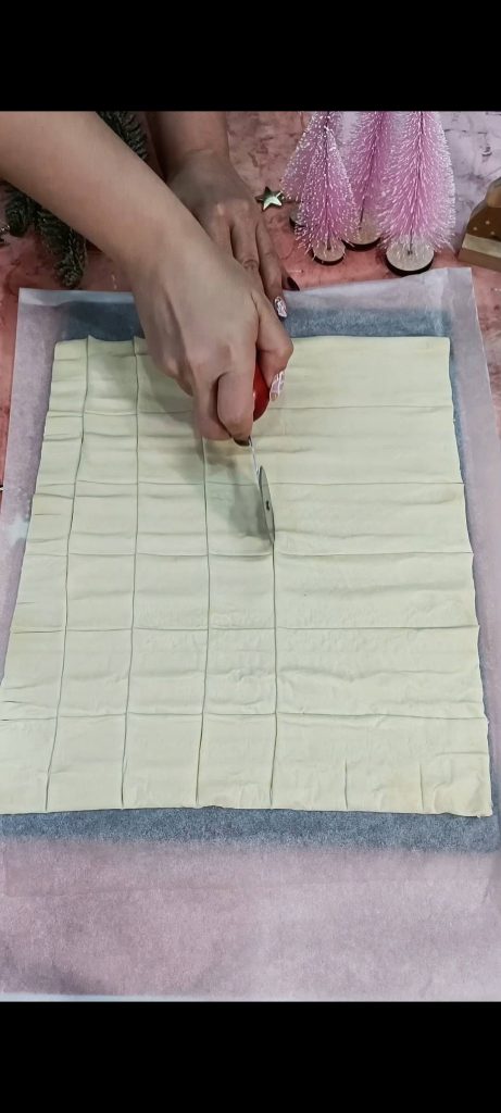 Rol het bladerdeeg uit en snijd het in 6 verticale en 6-7 horizontale stroken, om ongeveer 42 vierkantjes te verkrijgen.