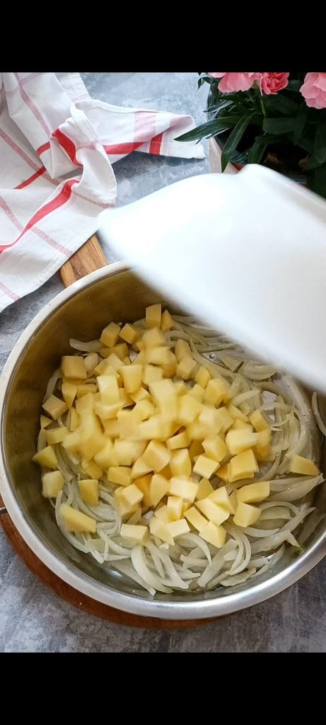 Schil de aardappelen, snijd ze in blokjes en voeg ze toe aan de pan om ze twee minuten op smaak te laten komen.
