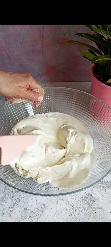Om de tiramisù truffels te maken, doe je eerst de mascarpone, poedersuiker en halfgeklopte room in een kom en meng je de ingrediënten goed met een spatel.