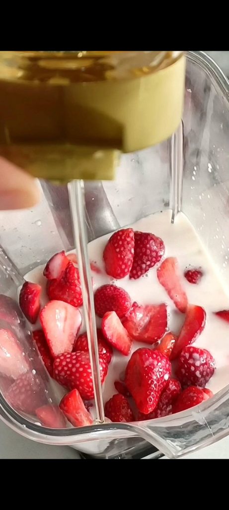 Herhaal dezelfde procedure met aardbeien, melk en agavesiroop. Voeg de chiazaadjes toe en meng goed. Laat ook dit mengsel minstens 2 uur in de koelkast rusten.