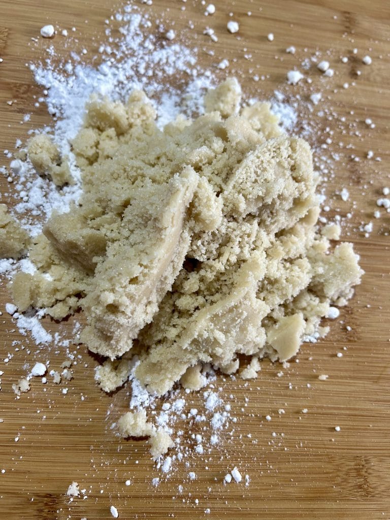 • Wanneer het deeg tussen je vingers plakt en een consistentie krijgt die lijkt op die van zanddeeg, leg het dan op een met poedersuiker licht bestoven werkvlak. Werk het deeg snel met je handen om het te compacteren en een homogeen klontje te vormen. Werk het niet te lang, anders begint het de olie van de amandelen vrij te geven.