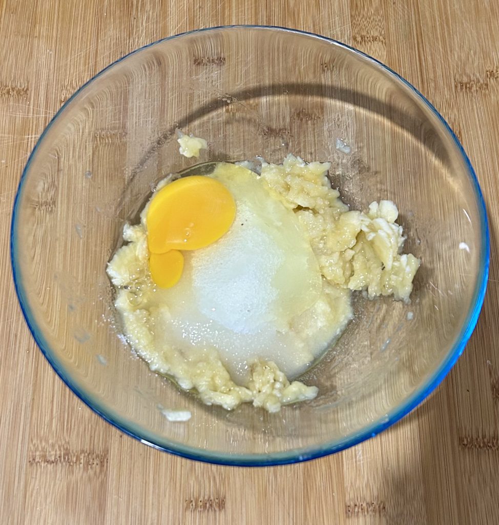 Ik voeg de suiker, de stevia en het ei toe, en meng alles tot een zachte en homogene massa.