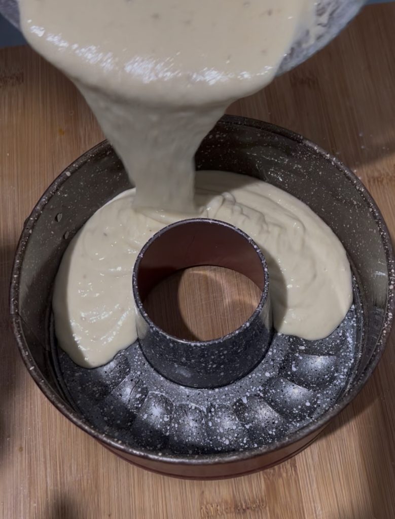 Ik giet het beslag in een licht ingevette tulbandvorm, strijk het oppervlak glad en doe het in de airfryer op 150°C voor ongeveer 25-30 minuten.