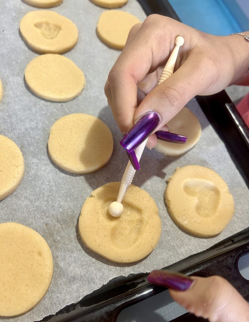 Om deze lieve koekjes te maken, heb je een ronde koekjesvorm en een gereedschap met een ronde punt nodig