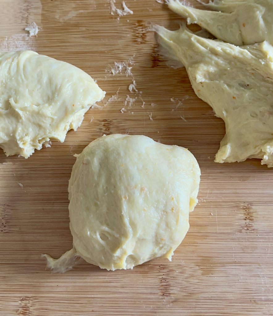 Als het eenmaal gerezen is, draaien we het deeg op een licht met bloem bestoven werkblad (echt weinig bloem is genoeg) en verdelen het in zoveel porties als het aantal brioches dat we willen maken.