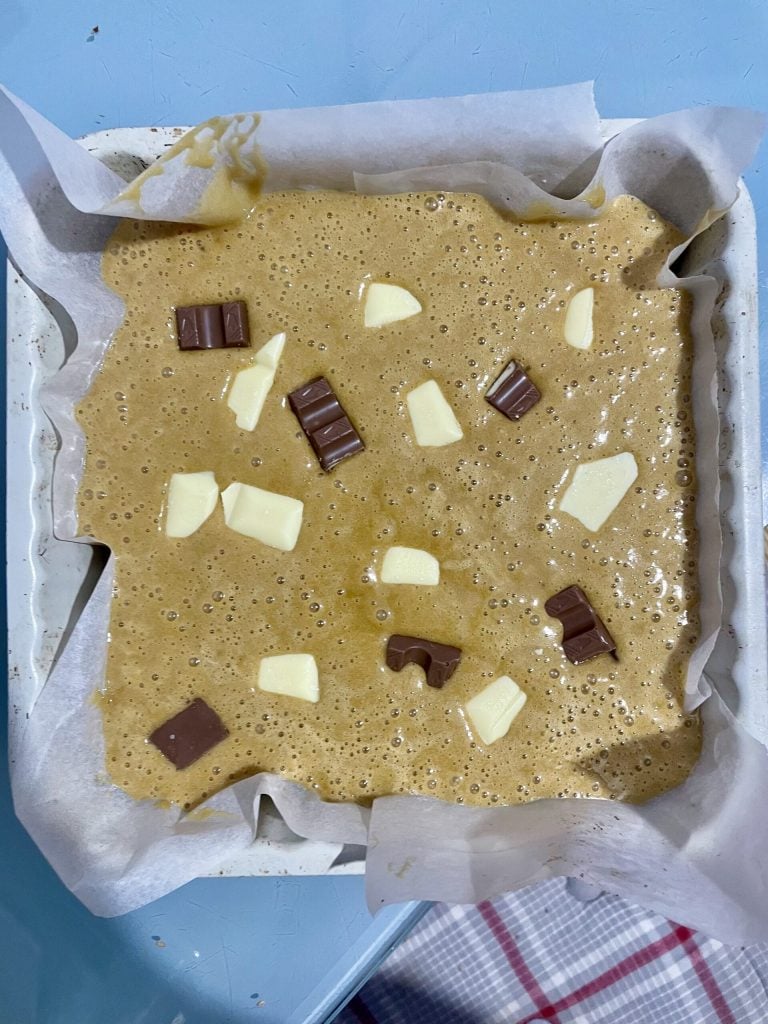 Mijn dochter, die graag de recepten reproduceert die ze in Amerikaanse video’s vindt en elke keer kleine aanpassingen doet om ze met gemakkelijk verkrijgbare ingrediënten te maken, heeft dit recept bereid dat een mooie mix is van de twee desserts. Het recept bevatte alleen witte chocolade in het beslag en 4/5 Kinderrepen als decoratie aan de oppervlakte, maar omdat we die niet in huis hadden, heeft ze 2 repen toegevoegd en wat witte chocolade bovenop toegevoegd.