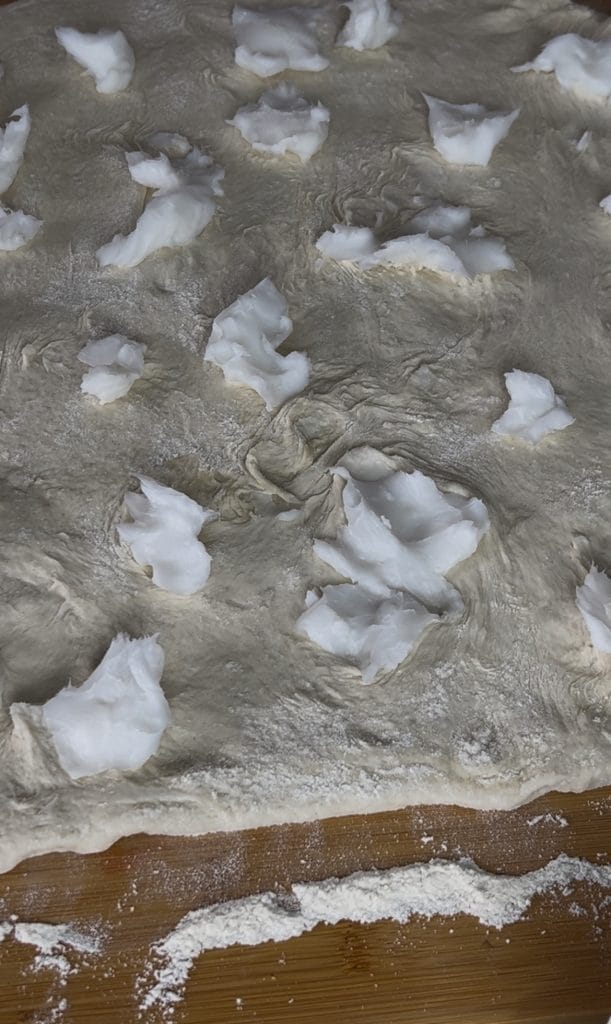 Na het rijzen, leg het deeg op een met bloem bestoven oppervlak, neem een kleine bal en houd deze apart.