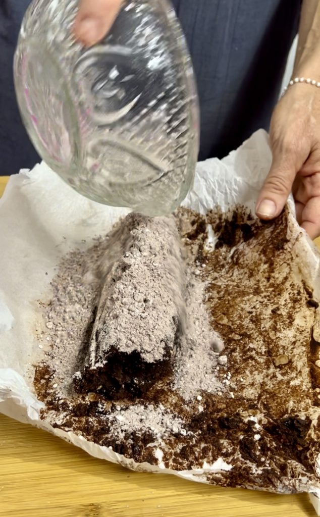 Strooi deze mix over de salami die in de koelkast rustte en bedek, met behulp van hetzelfde vel bakpapier, het hele oppervlak van de salami goed met de cacao- en suikerpoeder.