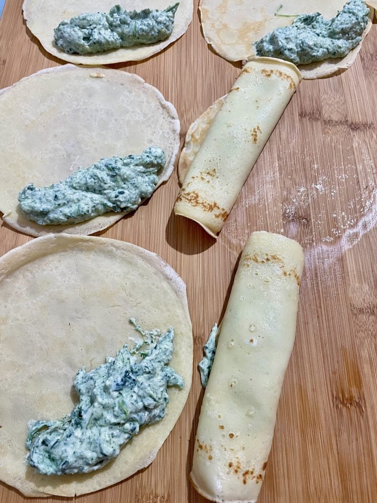 • Neem elke crepe en vul deze met een royale lepel vulling. Verdeel de vulling over één kant, probeer deze zo goed mogelijk uit te spreiden, en rol de crepe dan op zichzelf op, waardoor een cannolo ontstaat.