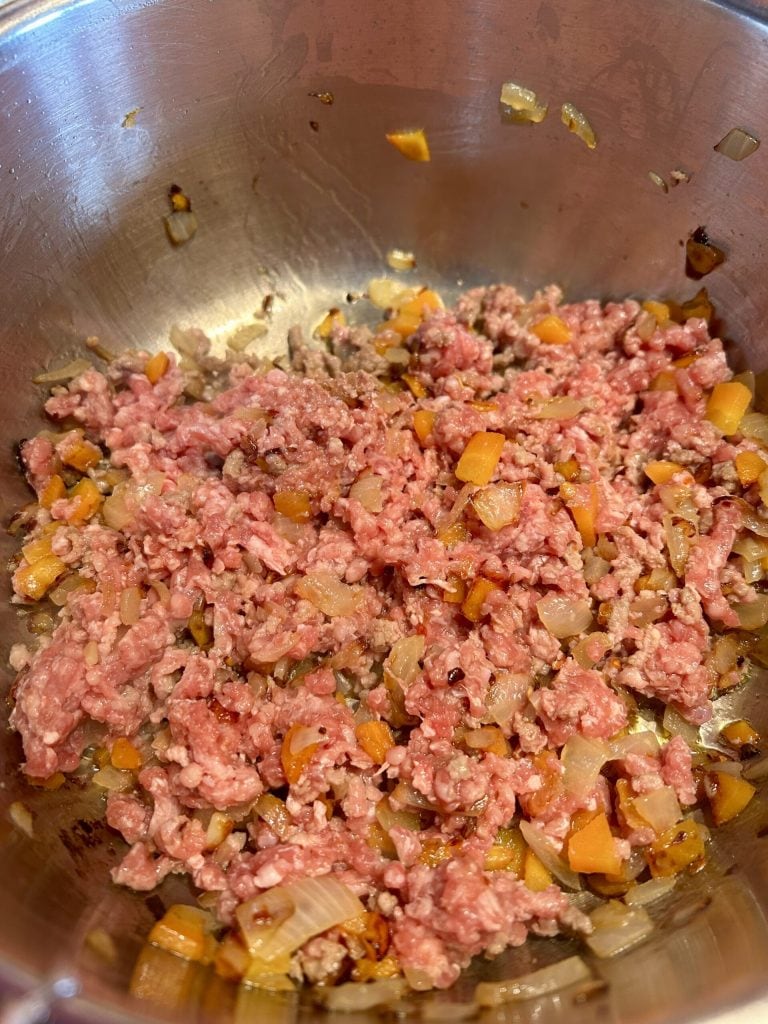 Maak de ui, selderij, knoflook en wortel schoon en hak ze fijn. Doe alles in een pan met de olie en een stukje chilipeper, als je van een pittige toets houdt. Bak op laag vuur tot de groenten goudbruin zijn en een heerlijke geur afgeven. Voeg vervolgens het gemengde gehakt toe, verhoog het vuur een beetje en bak het een paar minuten, terwijl je vaak roert om het goed te verkruimelen. Wanneer het van kleur verandert en goed aangebraden is, kun je verdergaan naar de volgende stap.