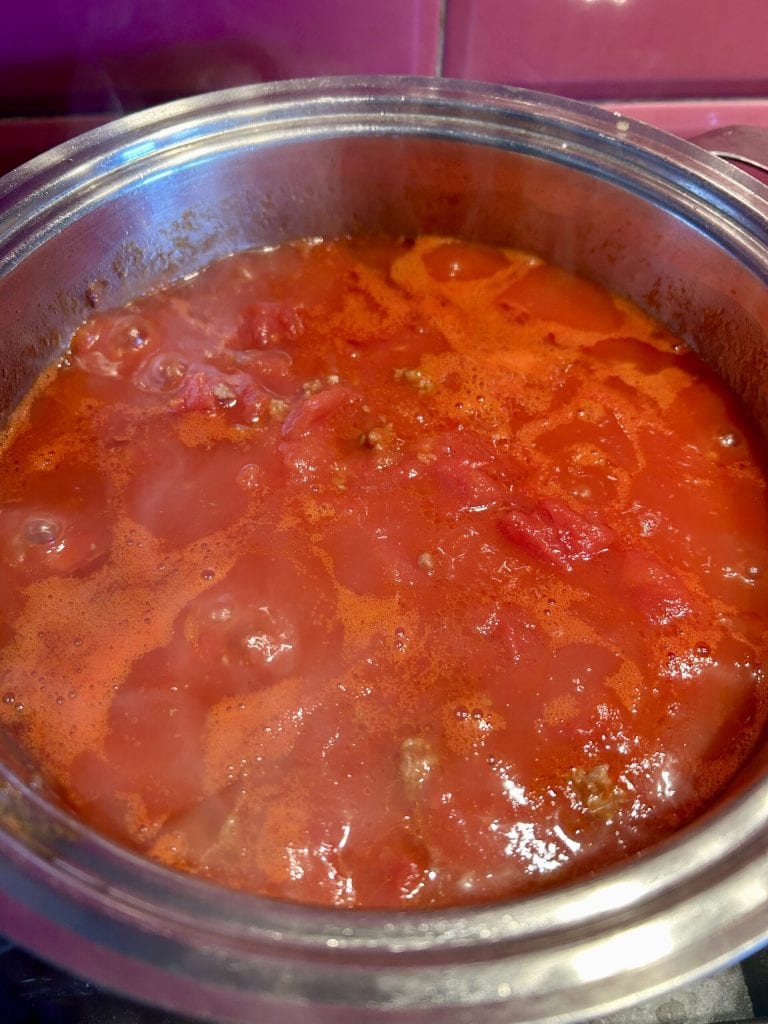 Voeg nu de tomatenpulp en een snufje grof zout toe. Zet het vuur hoog en breng aan de kook, zet daarna het vuur op het laagste stand en laat het zachtjes sudderen voor ongeveer twee uur, af en toe roerend.