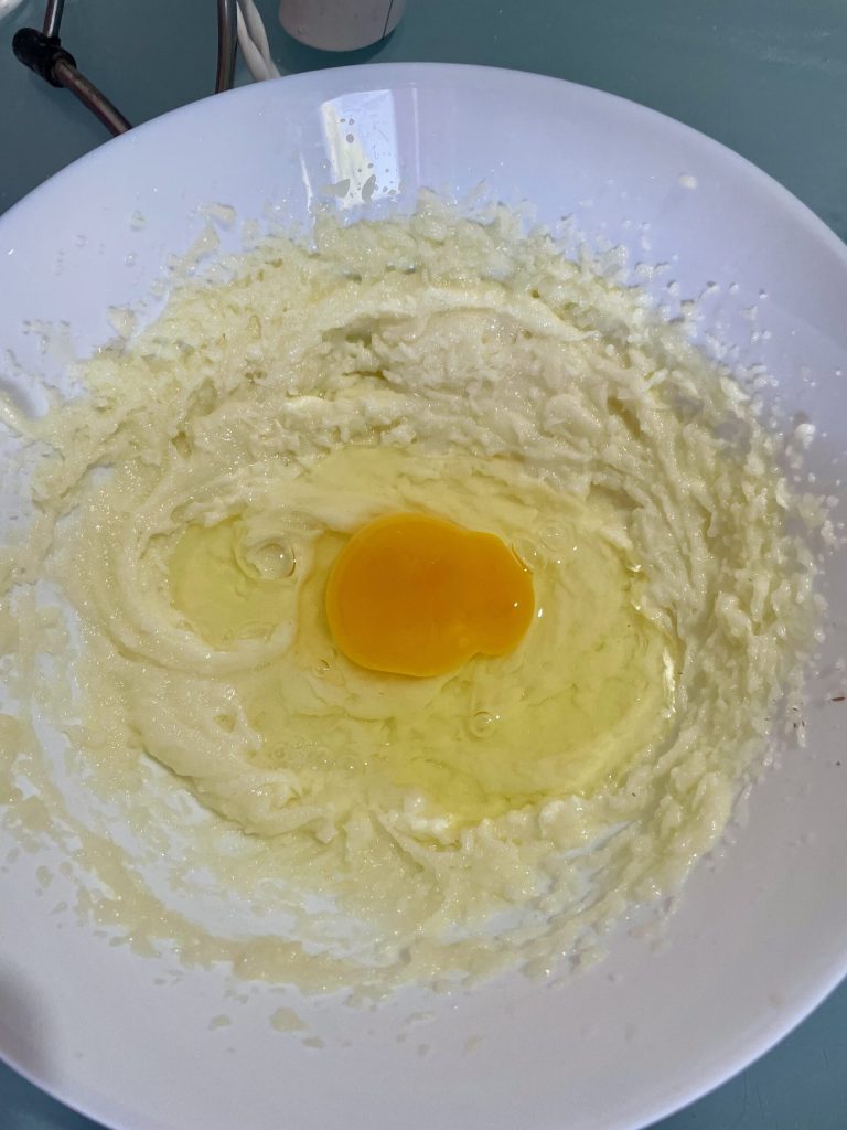 Nu moeten we de amandelvulling bereiden. Begin met het goed kloppen van de zachte boter met de suiker, voeg dan één voor één de eieren toe, terwijl u blijft mengen.